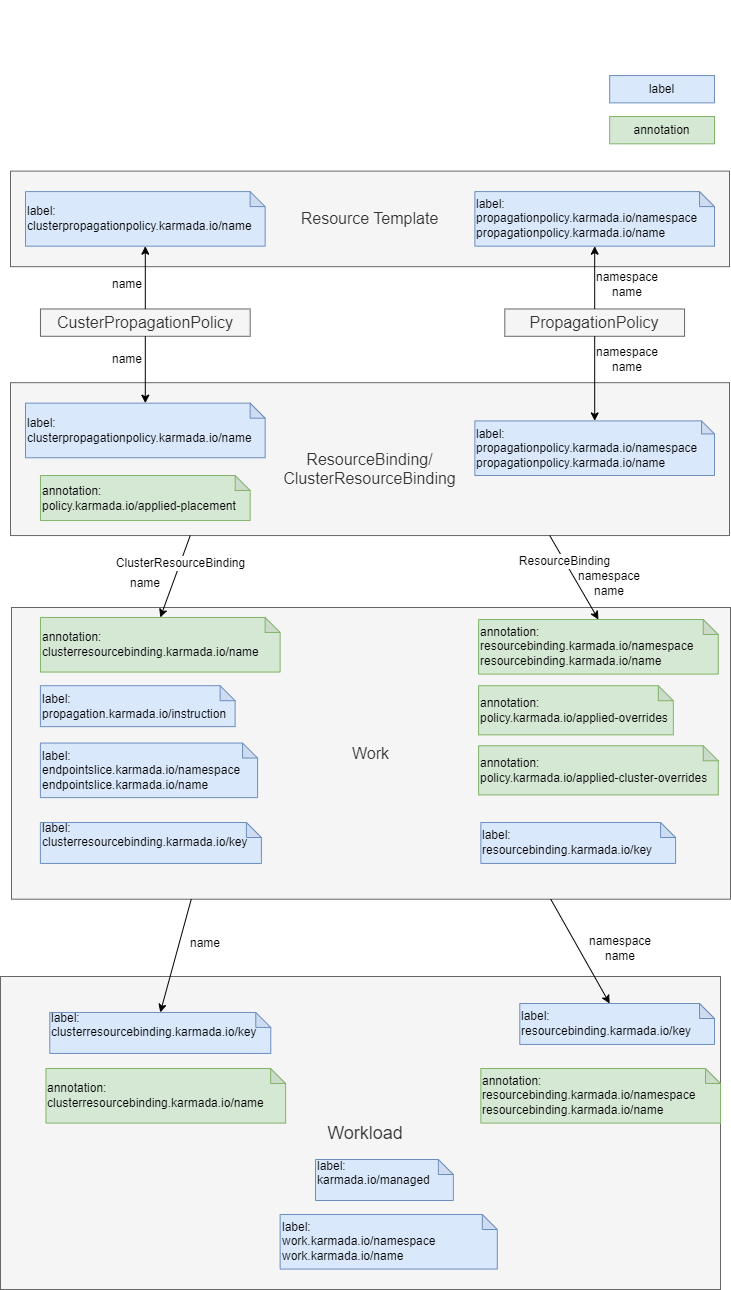 Workloadlabelwork.karmada.io/namespace work.karmada.io/nameDetermines whether the current workload is managed by Karmada. Through those labels, logic can find the associated Work or trace it back from the Work to the corresponding Workload.