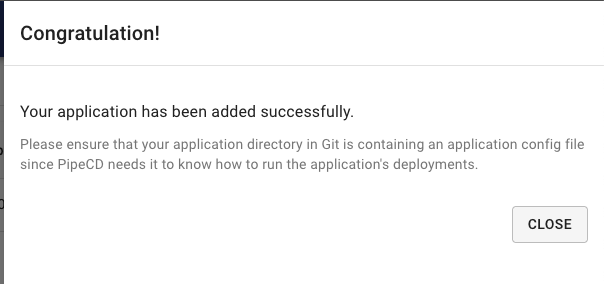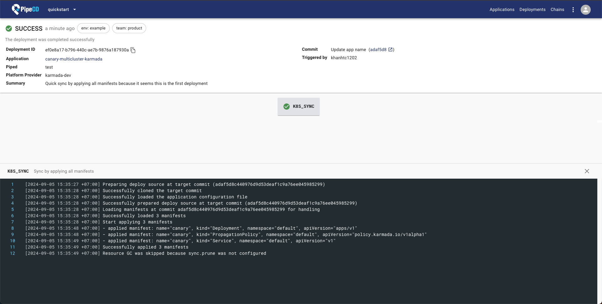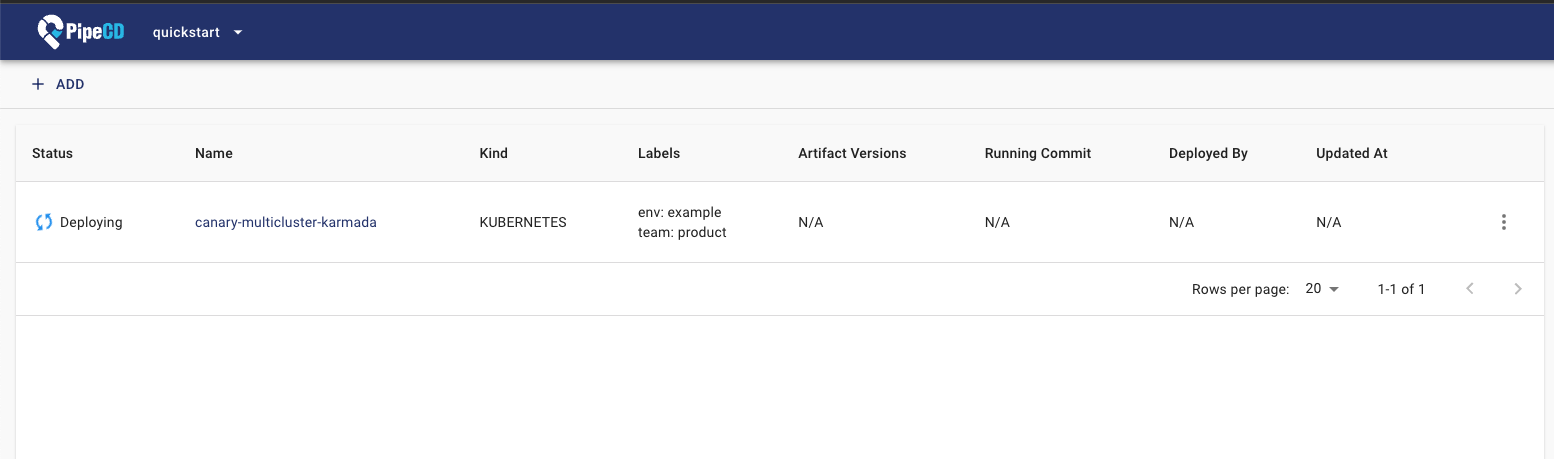 You don't need to do anything! After registered the application, PipeCD will automatically trigger the first deployment for it under Quick Sync strategy (for more about PipeCD sync strategy, refer to docs).
