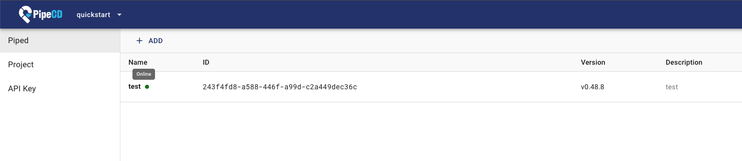 Note: The --insecure=true is required since we connect to the PipeCD control plane without SSL in the quickstart mode.