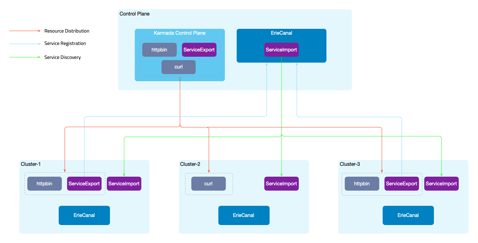 ErieCanal runs on both the control plane cluster and the member clusters. Member clusters need to be registered with the control plane cluster. ErieCanal is an independent component and does not need to run on the Karmada control plane. ErieCanal is responsible for multi-cluster service registration and discovery, while Karmada handles multi-cluster resource scheduling.