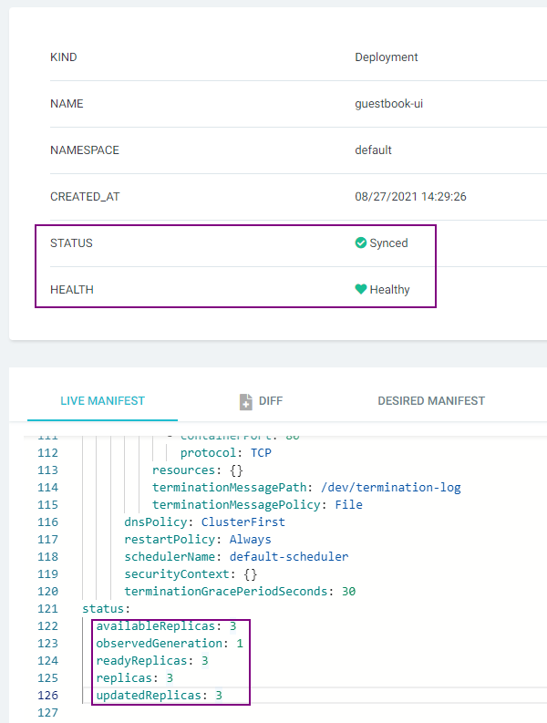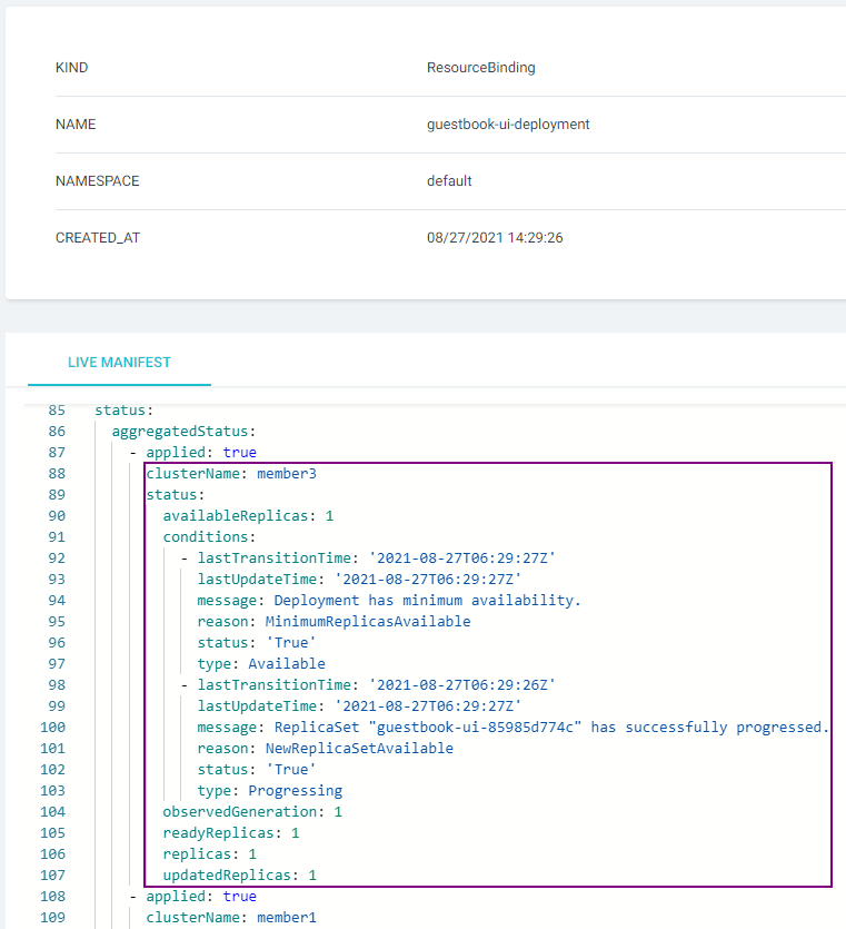 You can obtain the Deployment's detailed status by resourcebinding/guestbook-ui-deployment.