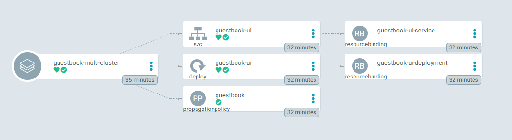 The svc/guestbook-ui, deploy/guestbook-ui and propagationpolicy/guestbook in the middle of the picture are the resources created by the manifest in the forked repo. And the resourcebinding/guestbook-ui-service and resourcebinding/guestbook-ui-deployment in the right of the picture are the resources created by Karmada.
