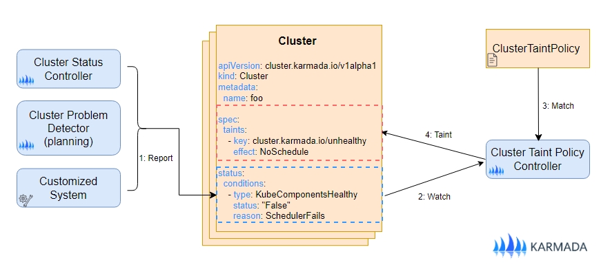 ClusterTaintPolicy API 允许管理员自定义基于特定条件为指定目标集群添加或移除污点的规则,这对于实施高级调度策略或故障迁移策略特别有用。